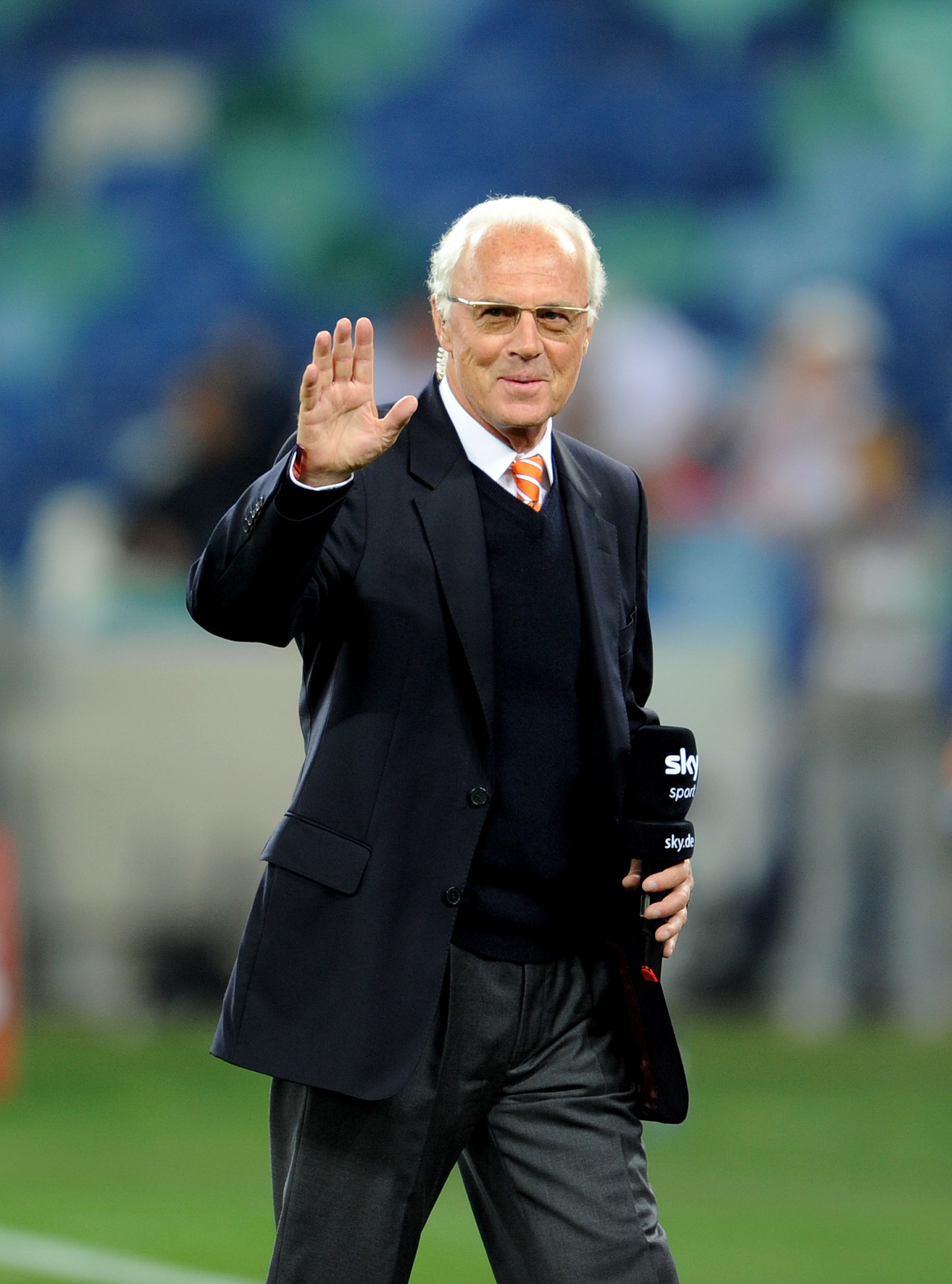 资料图:2010年7月7日,在南非德班举行的2010年足球世界杯德国队对阵西班牙队的半决赛前,贝肯鲍尔接受电视台采访时和友人打招呼。新华社记者王毓国摄