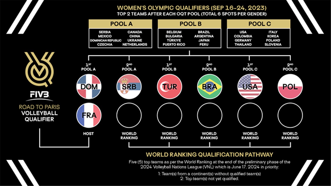巴黎奥运会排球比赛将于2024年7月27日至8月11日举行,目前男、女已各有6支球队通过预选赛获得参赛资格,东道主法国队自动获得席位。因此,男、女尚各有5个席位需根据奥运会前的世界排名决定。