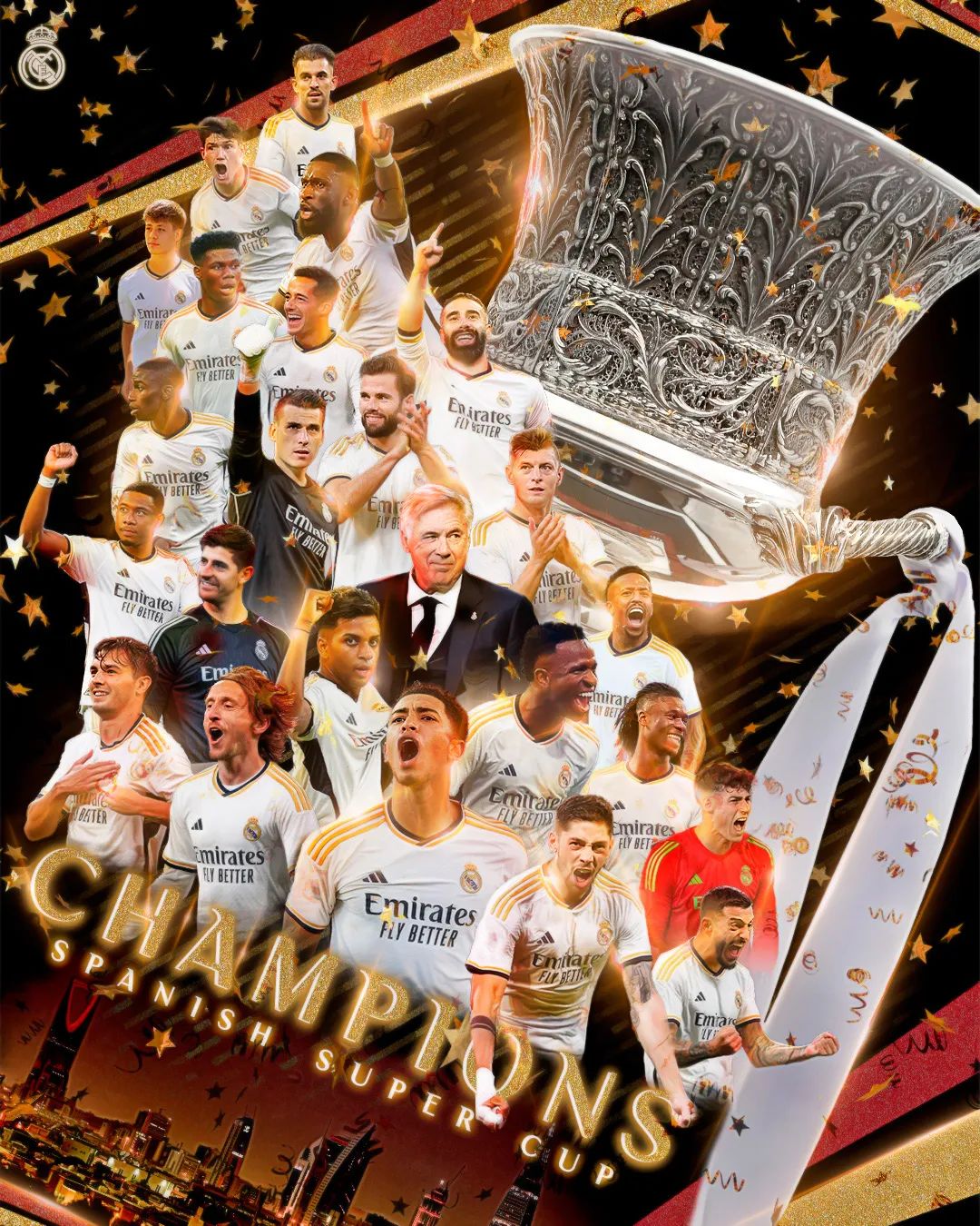 本场比赛,维尼修斯开场10分钟先后接贝林厄姆和罗德里戈的助攻,两度破门,完成双响,皇马取得梦幻开局。随后,莱万凌空抽射为巴萨扳回一城。第39分钟,阿劳霍放倒维尼修斯,吃到“黄点套餐”,后者操刀稳稳命中,上演“帽子戏法”。下半场,孔德解围失误,罗德里戈推射破门,阿劳霍吃到第二张黄牌被罚下,皇马4:1战胜对手。此役,连进三球的维尼修斯获得全场MVP,这也是他皇马生涯的第十座冠军奖杯。