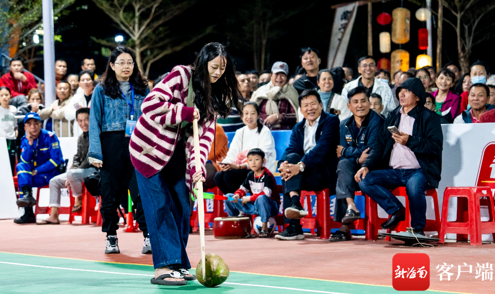 1月21日晚,椰子拔河、椰子保龄球、赶椰子登封互动游戏陆续出现在赛场上。游戏一上新,就吸引了众多观众举手报名。这些游戏不仅为现场营造了快乐的氛围,也让参与者和现场观众念念不忘。