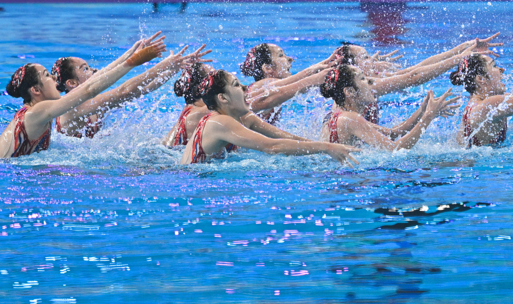 当日,2024年世界游泳锦标赛花样游泳集体技术自选决赛在卡塔尔多哈举行,中国队以299.8712分的成绩获得冠军。