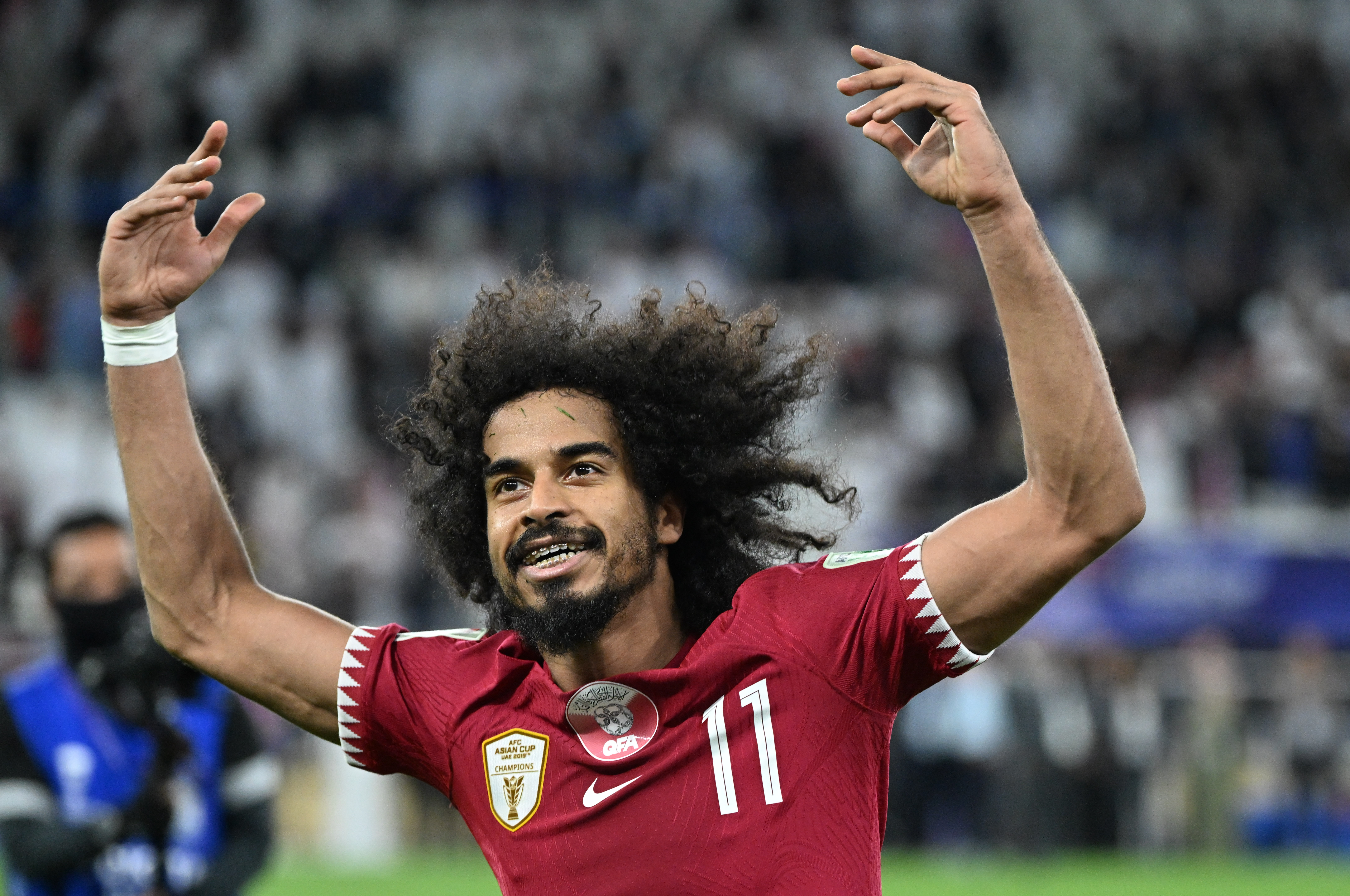 2月7日,卡塔尔队球员阿菲夫赛后庆祝胜利。新华社记者孙凡越摄