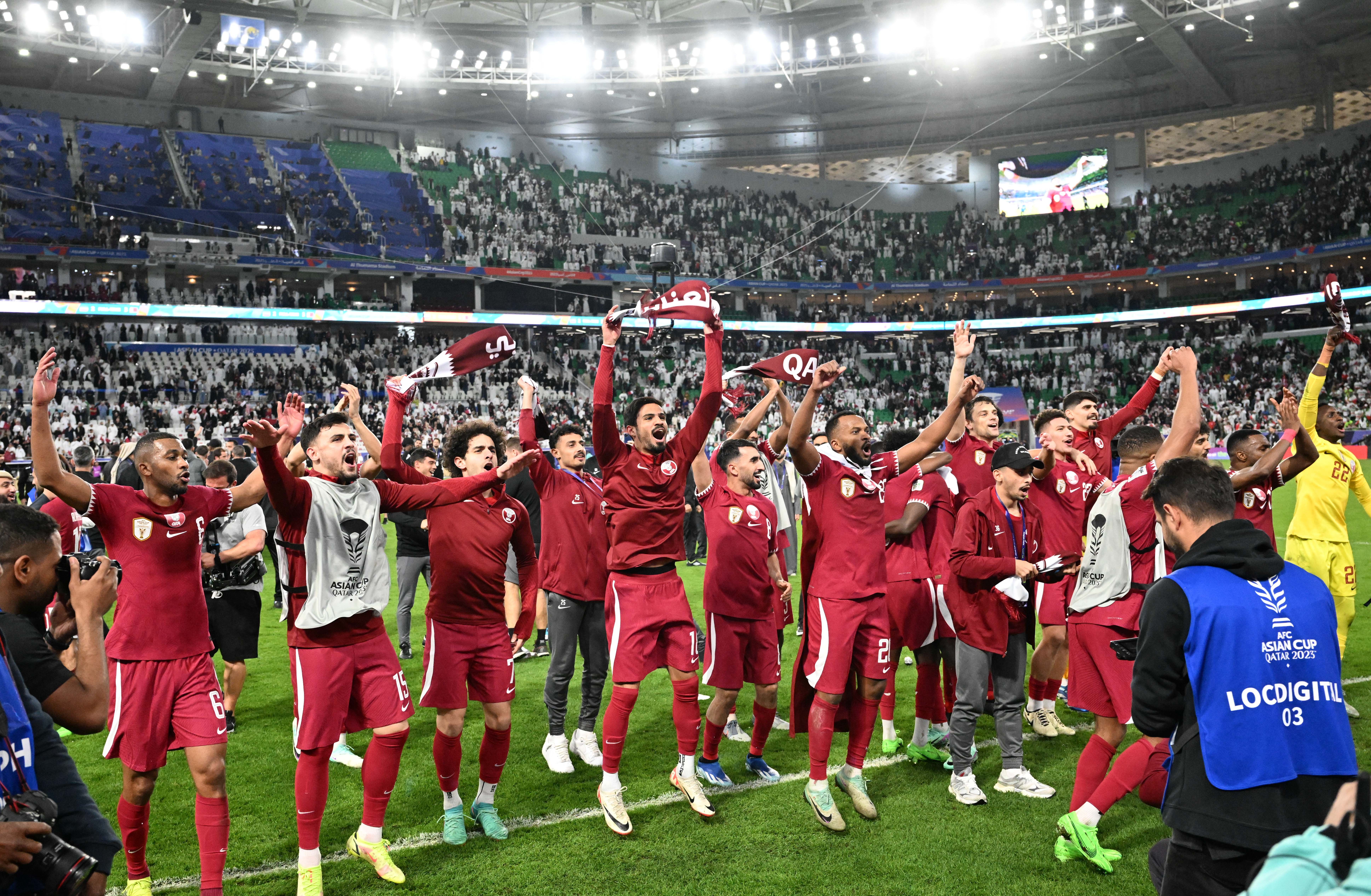 2月7日,卡塔尔队在赛后庆祝胜利。新华社记者孙凡越摄