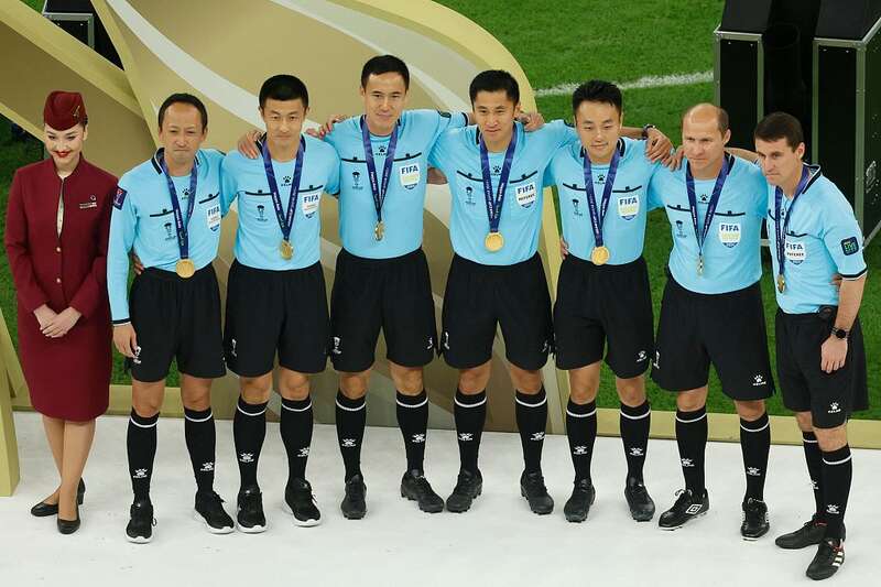 中国裁判组首次主裁亚洲杯决赛。图为亚洲杯决赛裁判组所有成员赛后合影。视觉中国供图