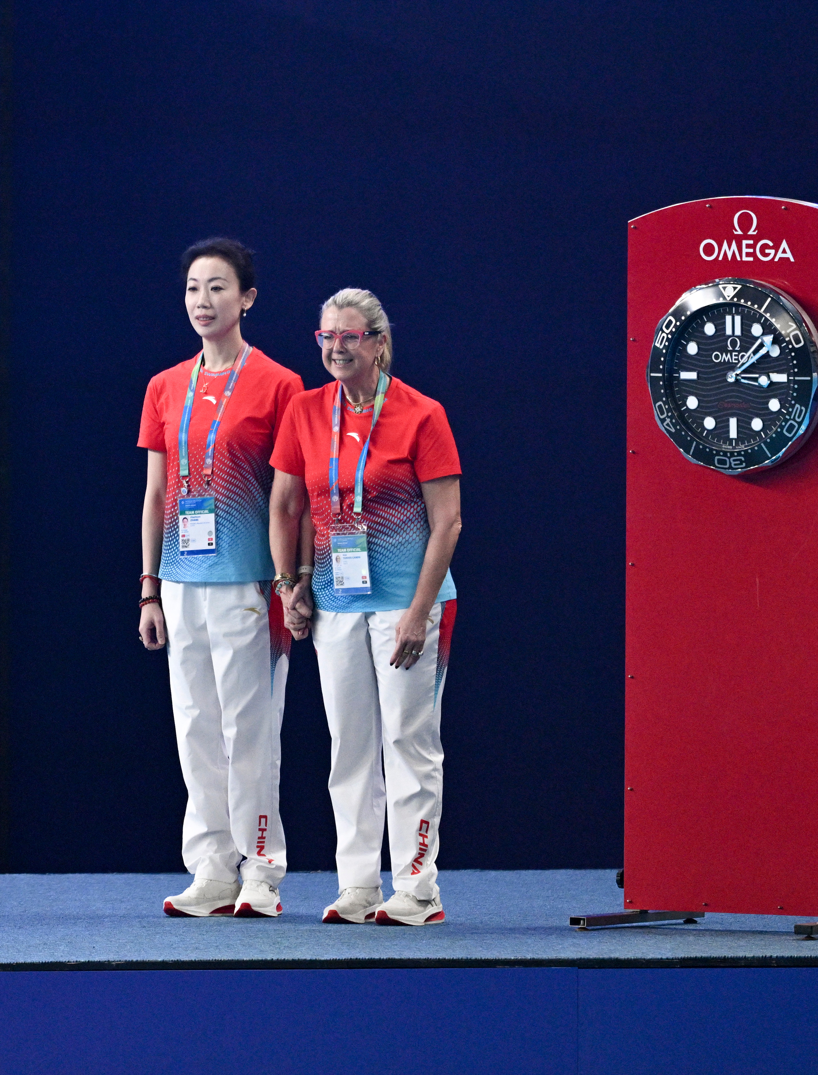 2月6日,中国队教练张晓欢(左)、安娜在场边观赛。当日,2024年世界游泳锦标赛花样游泳集体技术自选决赛在卡塔尔多哈举行,中国队获得冠军。新华社记者夏一方摄