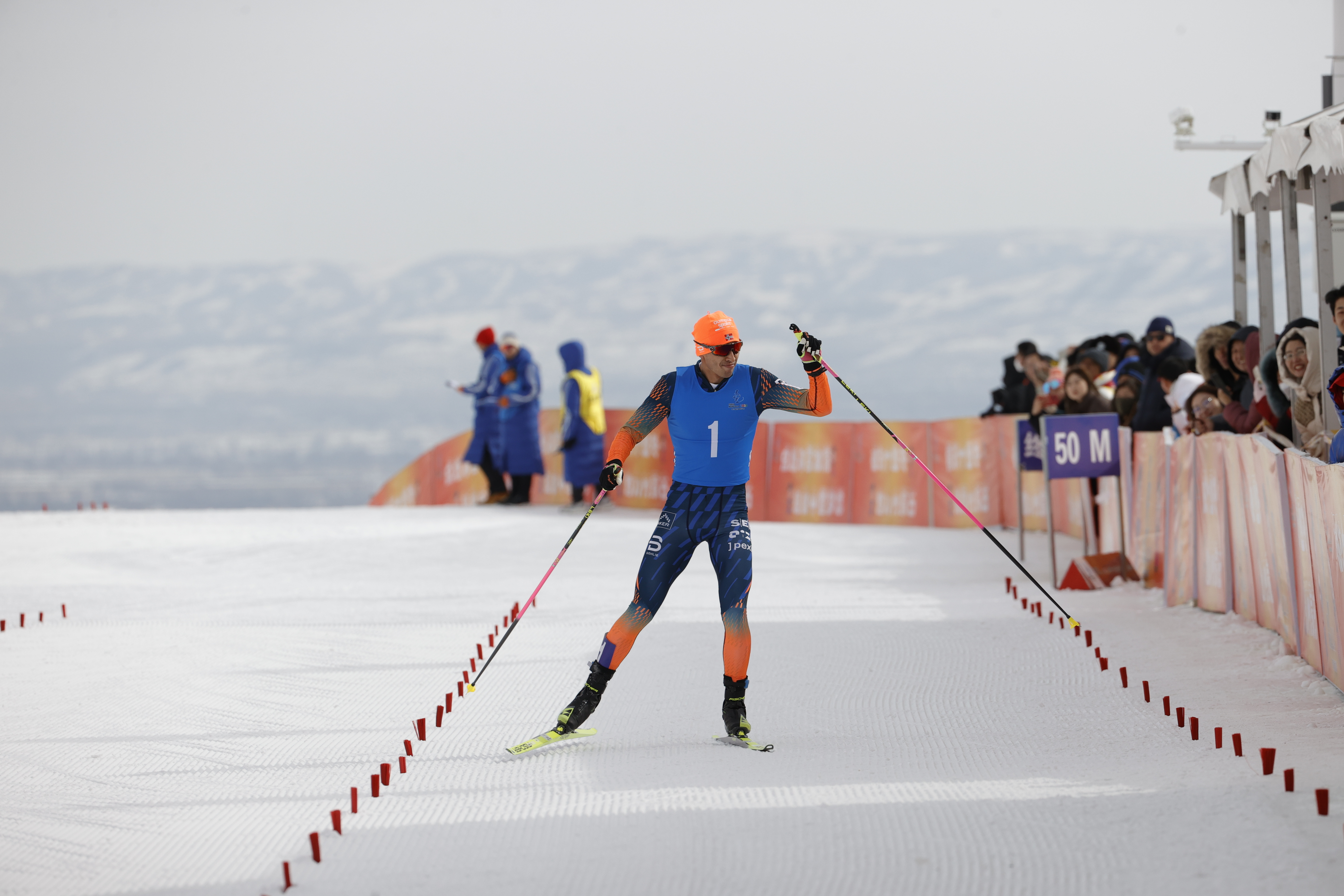 越野滑雪公开组男子双追逐比赛中,重庆运动员王强冲线瞬间。华龙网特派记者 石涛 摄