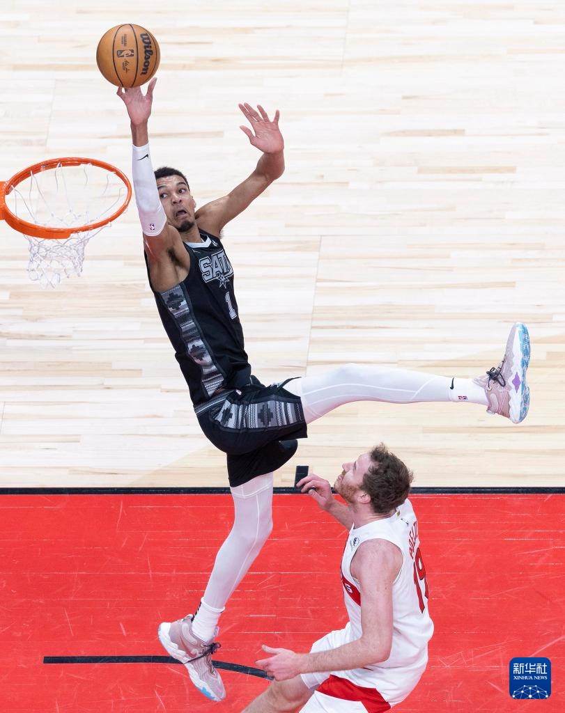2月12日,马刺队球员维克多·文班亚马(中)在比赛中扣篮。新华社发(邹峥摄)