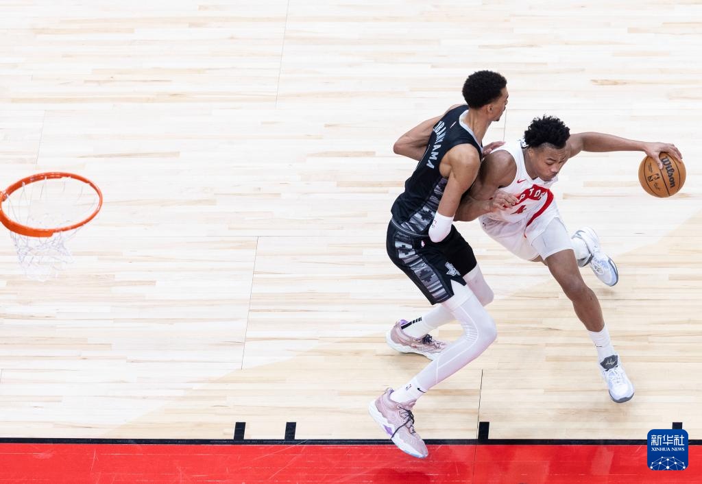 2月12日,猛龙队球员雅各布·珀尔特尔(右)在比赛中试图封盖马刺队球员维克多·文班亚马(左)的上篮。新华社发(邹峥摄)