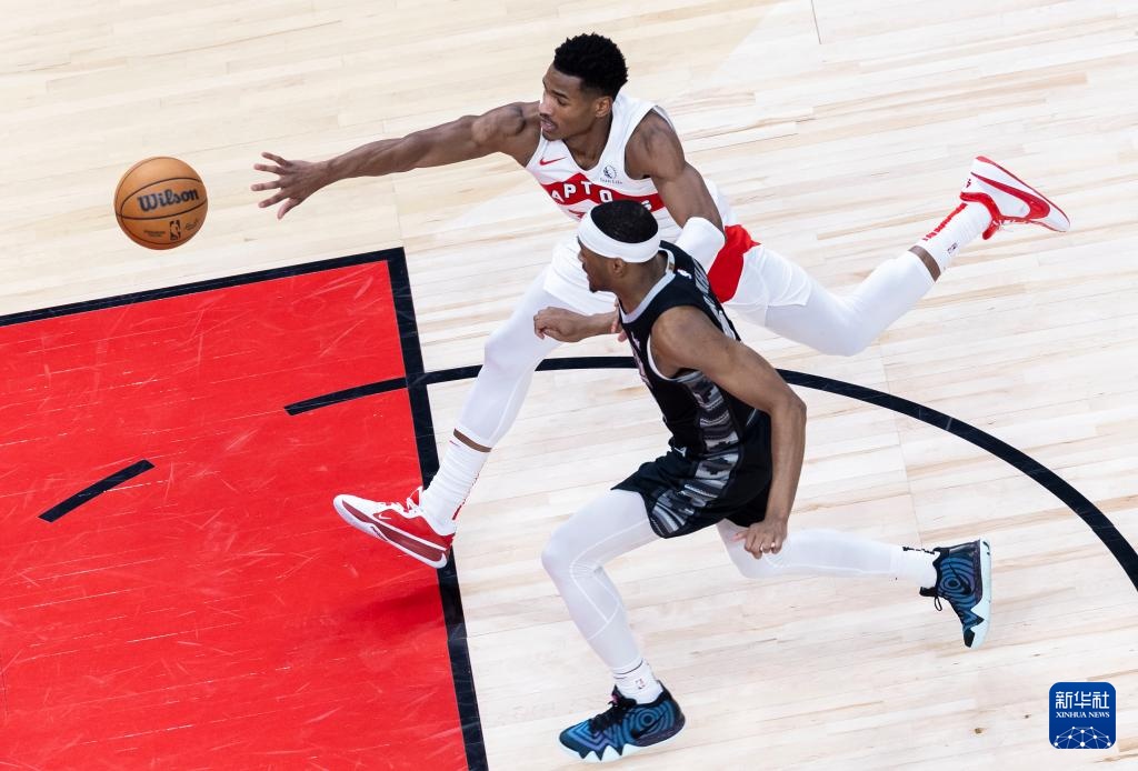 2月12日,猛龙队球员斯科蒂·巴恩斯(右)在比赛中进攻。新华社发(邹峥摄)
