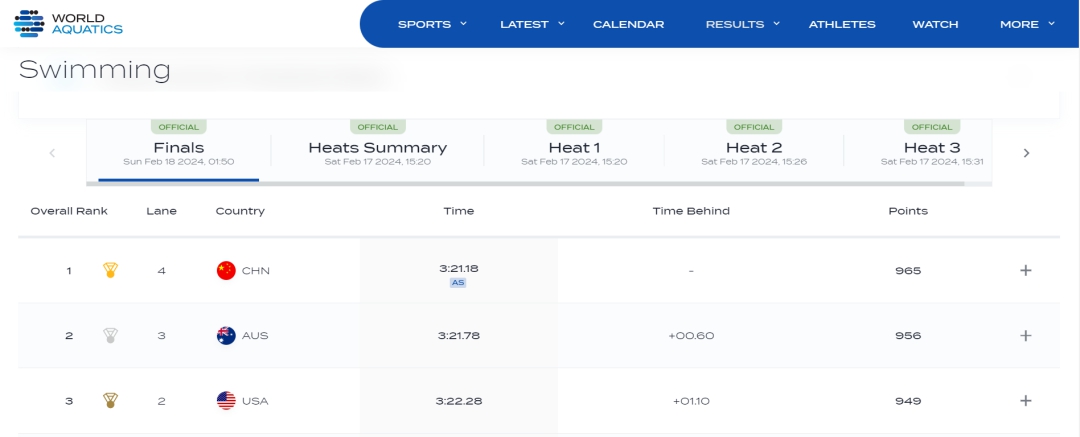在预赛中,中国队便状态不俗,游出了3分24秒47的成绩,打破了由日本队保持的亚洲纪录(3分24秒67),排名第一晋级决赛。