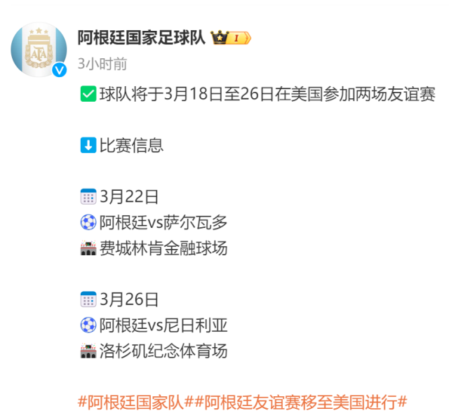22日,阿根廷国家足球队、阿根廷足协官方微博发布比赛信息,称阿根廷友谊赛移至美国进行:球队将于3月18日至26日在美国参加两场友谊赛。据@北青体育称,比赛原定在中国进行。