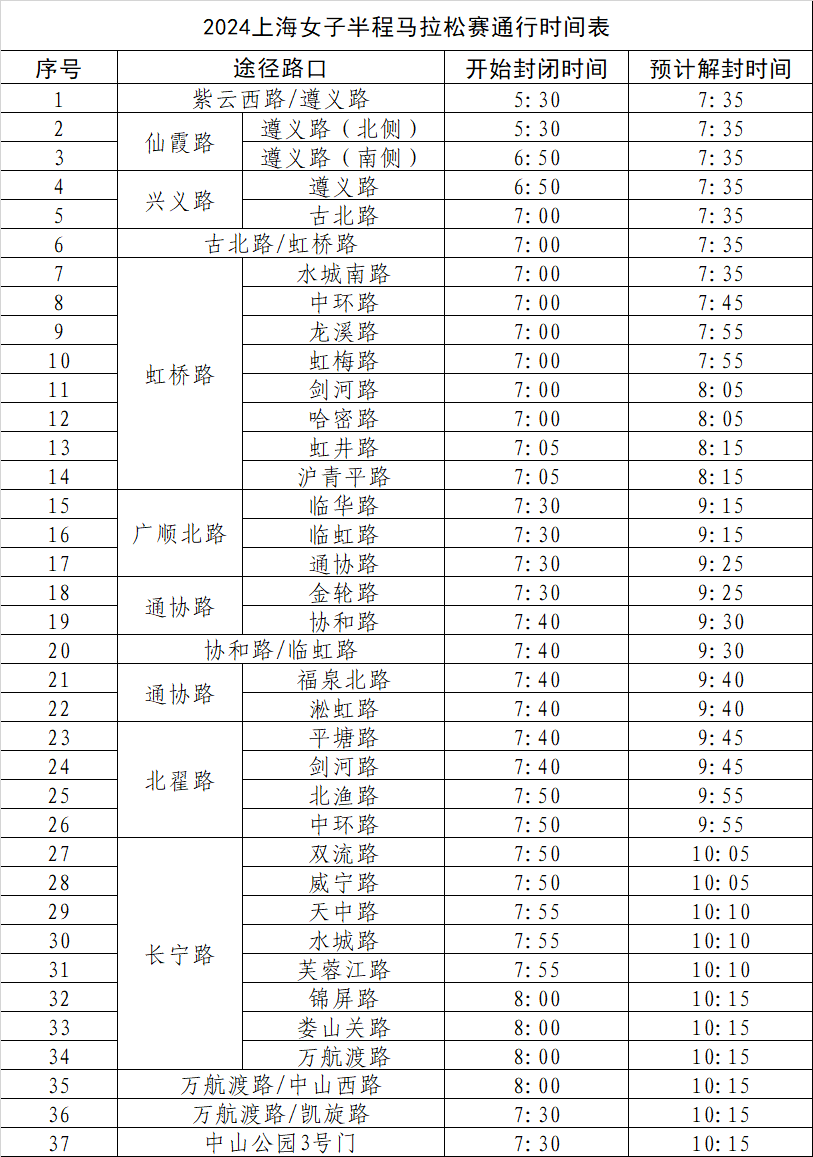 3、其余赛事主线3月10日6时50分至10时15分,在运动员临近时实施逐步封闭:兴义路-古北路-虹桥路-环绿路-外环生态绿道-广顺北路-通协路-协和路(逆向、折返)-通协路-淞虹路(逆向辅道)-北翟路(逆向)-长宁路(逆向)-万航渡路凯旋路