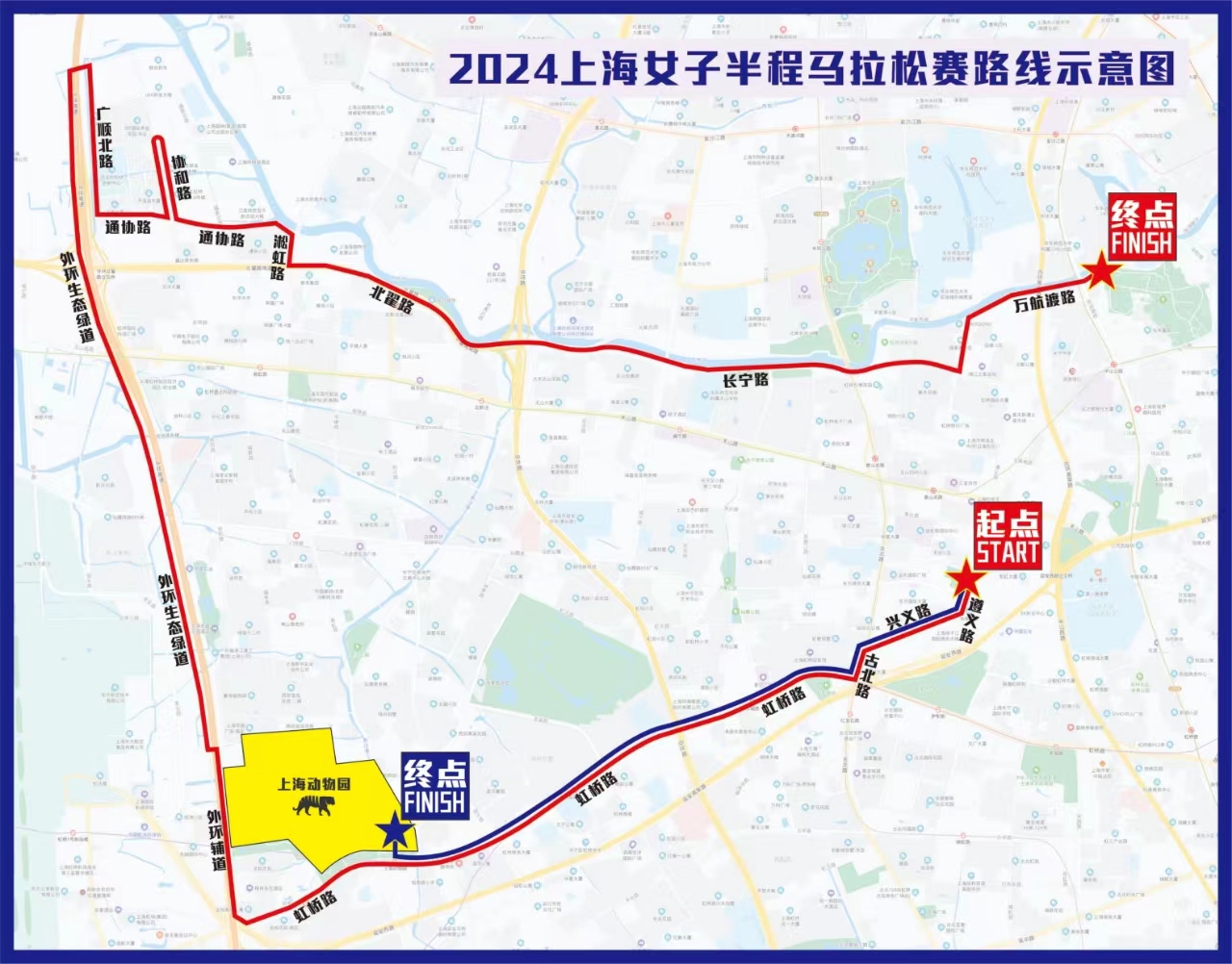 1、女子半程马拉松线路:起点(遵义路尚嘉中心)—遵义南路—兴义路—古北路—虹桥路—环绿路—外环生态绿道—广顺北路—通协路—协和路(逆向、折返)—通协路—淞虹路(逆向辅道)—北翟路(逆向)—长宁路(逆向)—万航渡路—终点(中山公园3号门)