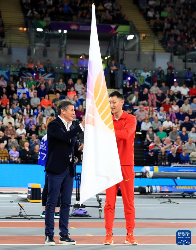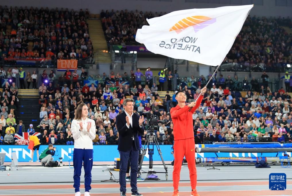3月3日,中国田径运动员王嘉男(右)在会旗交接仪式上挥舞世界田联旗帜。2025年室内田径世锦赛将在中国南京举行。新华社记者李颖摄
