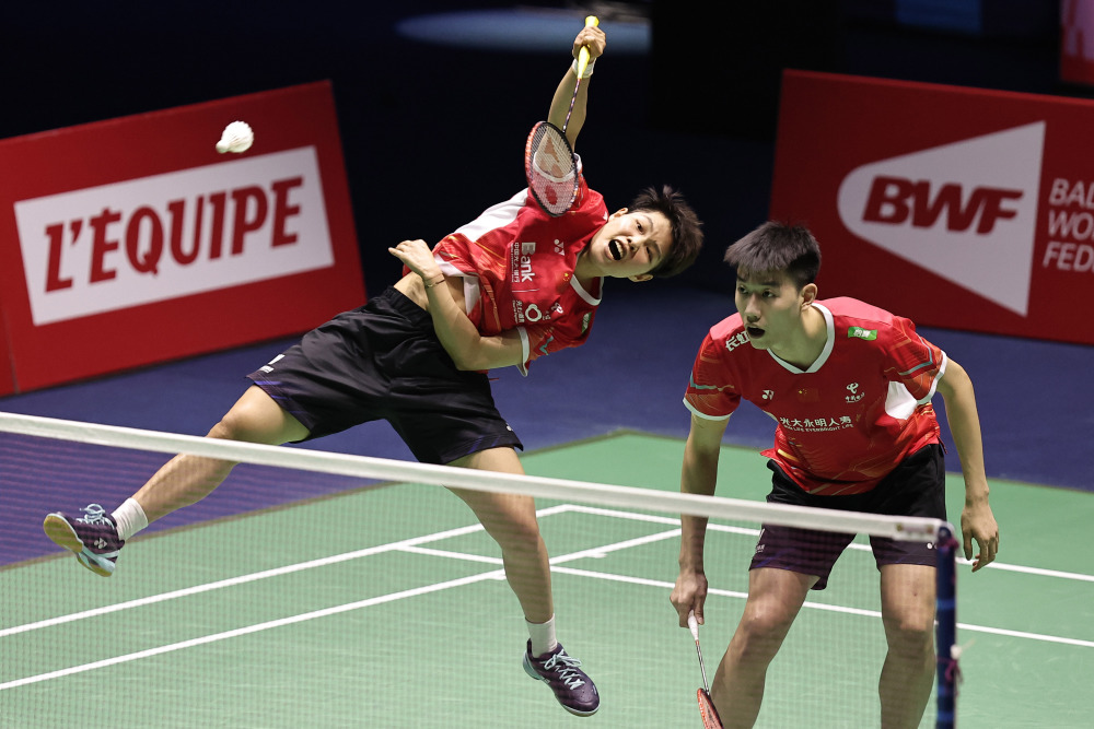 3月10日,冯彦哲/黄东萍(左)在比赛中。 新华社发(奥雷利安·莫里萨尔摄)