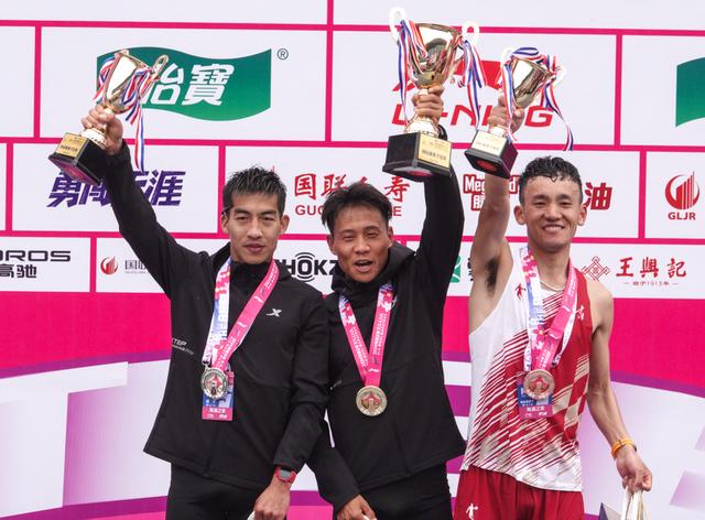 3月24日无锡马拉松,冠军何杰(中)、亚军杨绍辉(左)和季军桑吉东知。新华社记者 杨磊 摄更令人高兴的是