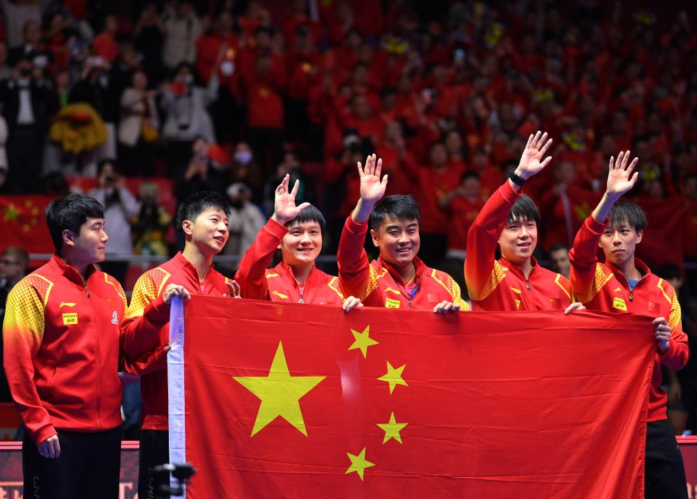 △2月25日,中国队教练王皓(右三)、选手梁靖崑(左一)、马龙(左二)、樊振东(左三)、王楚钦(右二)、林高远夺冠后庆祝。图/新华社