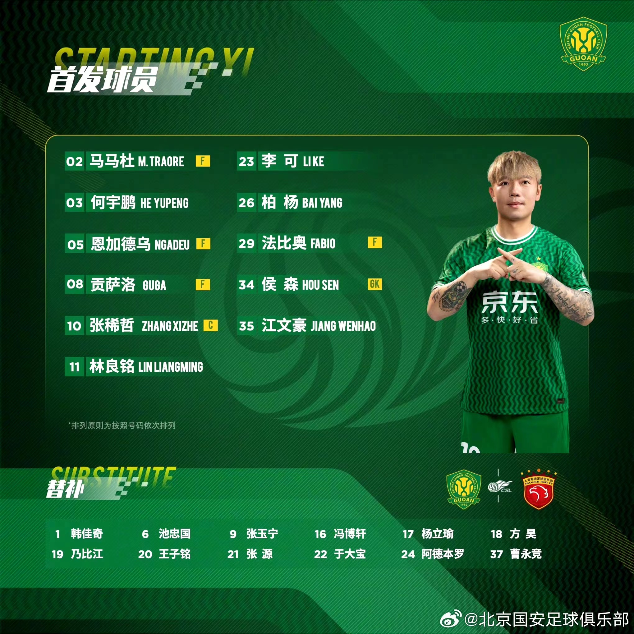国安首发11人为:门将侯森,后卫恩加德乌、特拉奥雷、柏杨、中场何宇鹏、李可、古加、江文豪,前锋林良铭、法比奥、张稀哲。