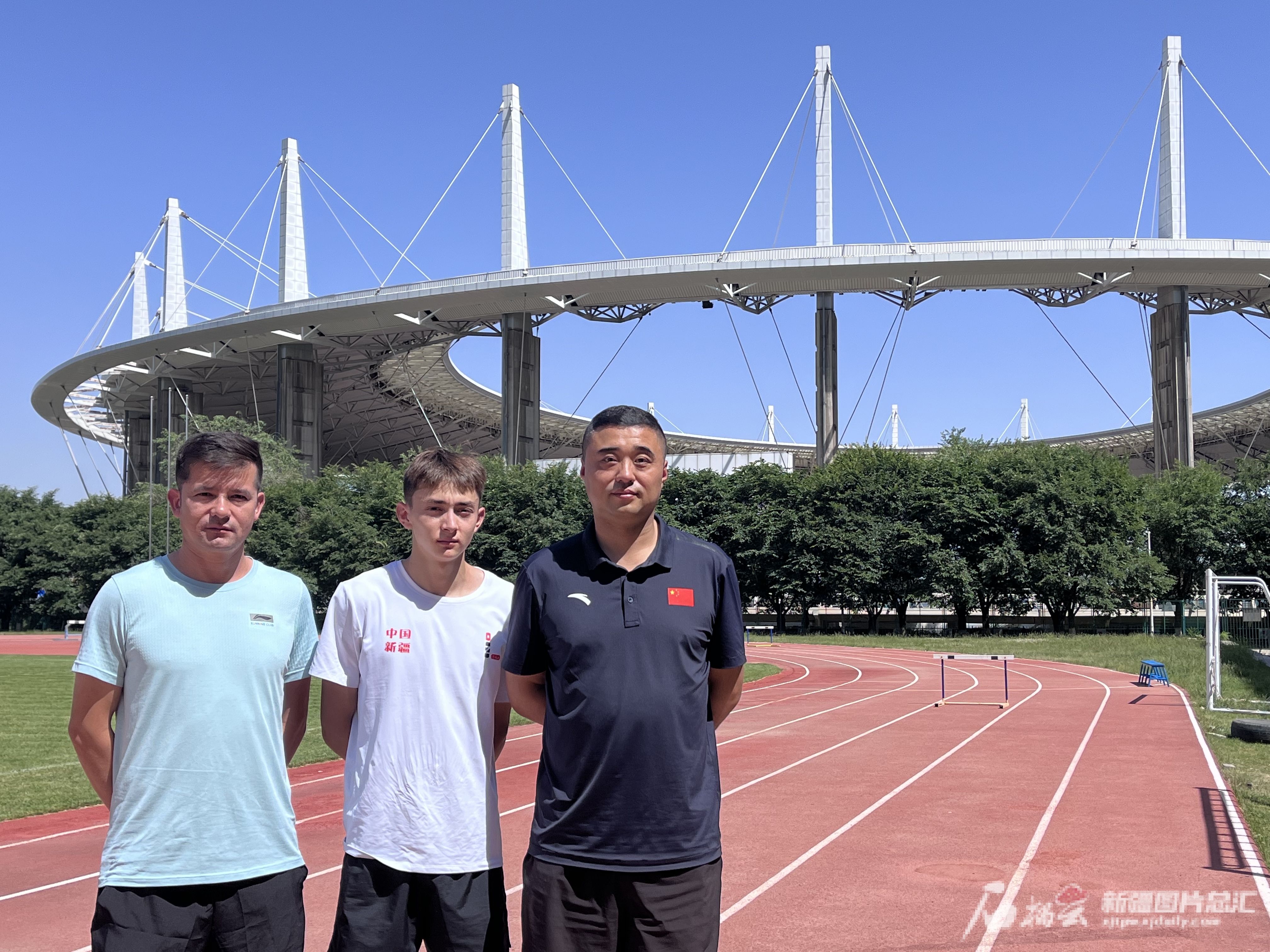 自治区体育局体育训练一大队训练场,艾力西尔·吾买尔和田径项目短跑组主教练张洋(右一)、体能教练阿不都维力·阿不都卡迪尔。资料图