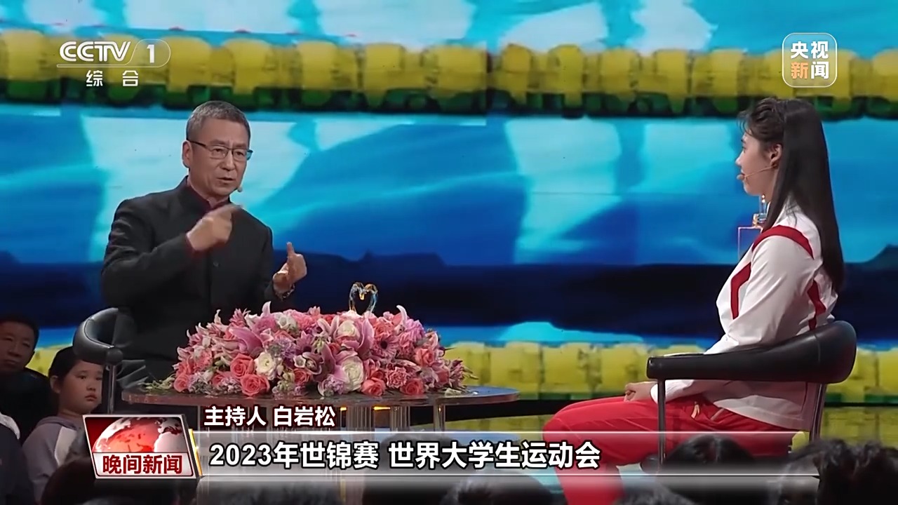 主持人 白岩松:有人给你算过账。2023年世锦赛、世界大学生运动会、亚运会、世界杯三站,参加了59项拿了23块金牌。平均四天一次比赛,不累吗?