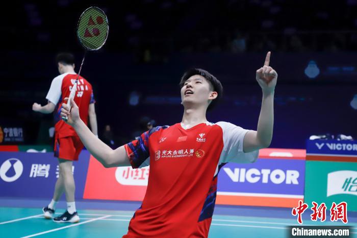 4月10日,2024年亚洲羽毛球锦标赛男双首轮比赛中,中国男双组合刘雨辰/欧烜屹淘汰对手晋级。图中举拍庆祝者为刘雨辰。 肖剑摄