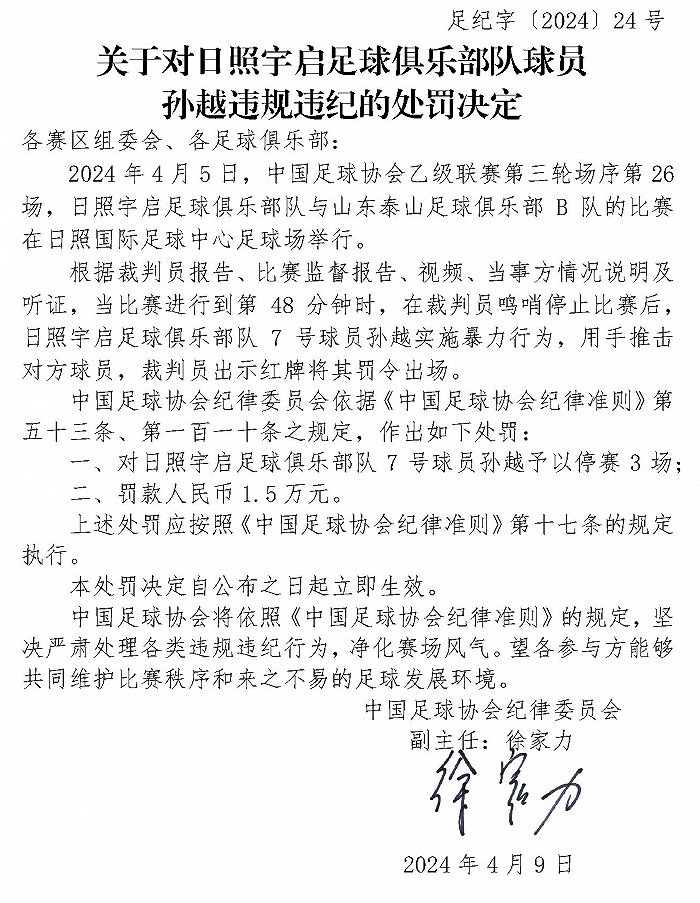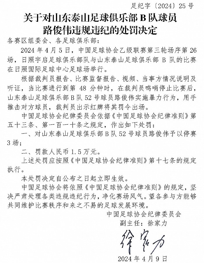 中国足协:山东泰山B队路俊伟、日照宇启孙越因实施暴力行为被停赛3场罚1.5万元