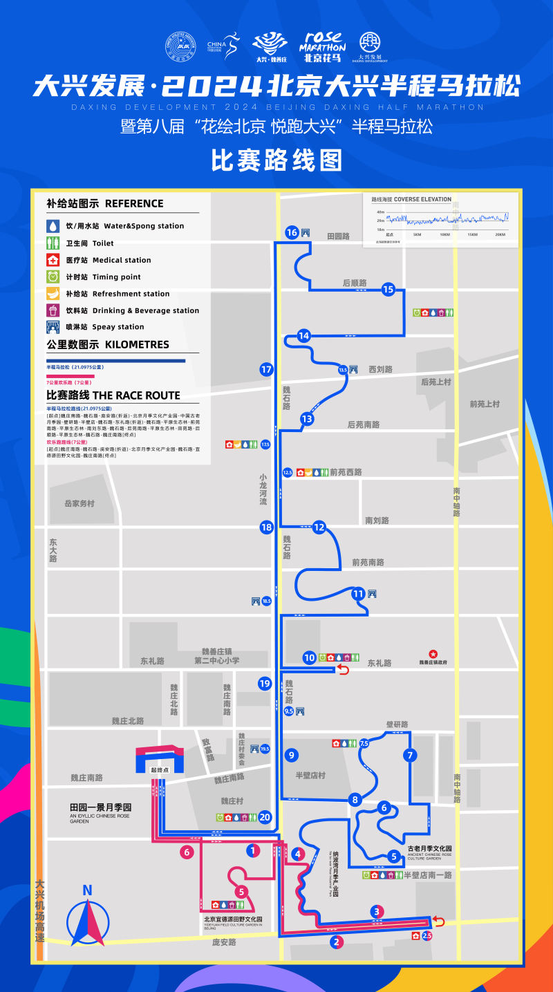 今年北京花马的赛事路线,经过特别设计,调整开跑之后的方向,前半程将穿过魏庄村、半壁店村、纳波湾月季园、平原生态林等区域,让跑者在较为舒适的阶段,以更加轻松心态欣赏周边环境。赛道后半段,以魏石路为主要赛道路段,折后半程路线拥有大量直道,更加适宜希望取得佳绩的专业跑者在关键赛段寻求突破,完成这场花海中的半程马拉松比赛。
