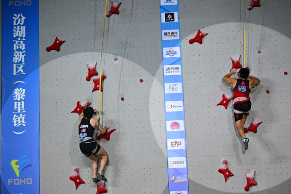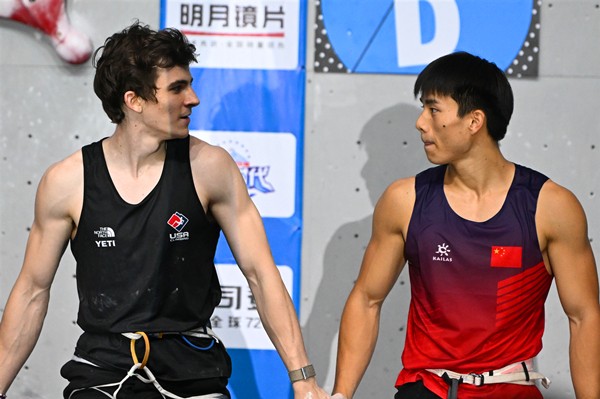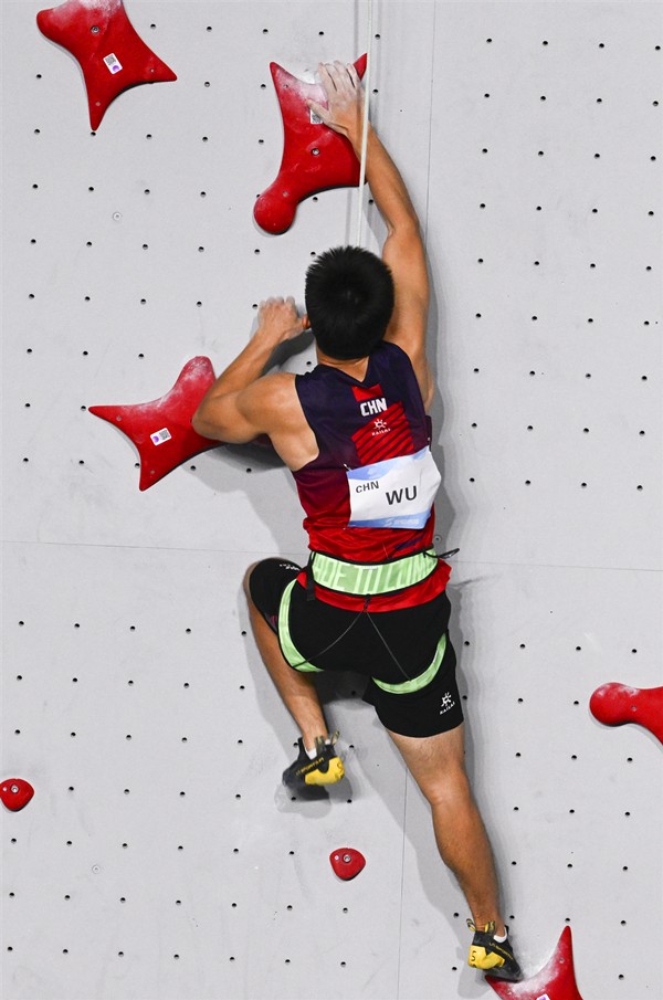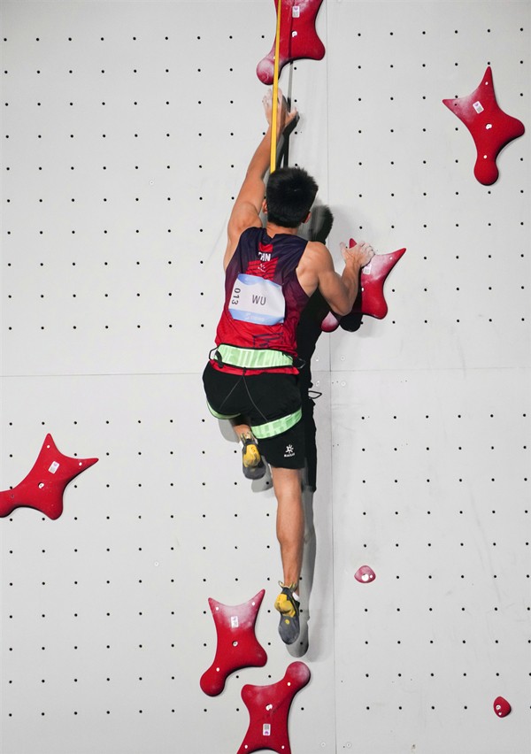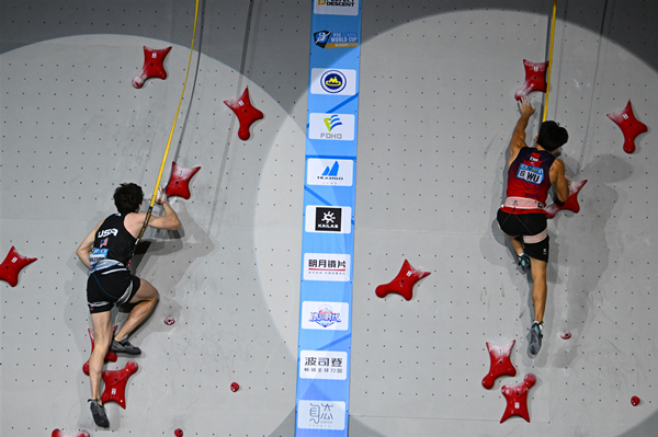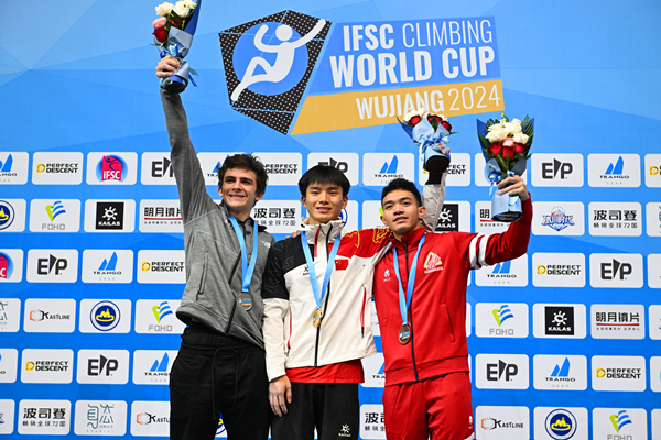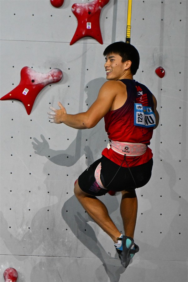 当日,在江苏吴江举行的2024年国际攀联攀岩世界杯(吴江站)男子速度决赛中,中国选手伍鹏获得冠军。