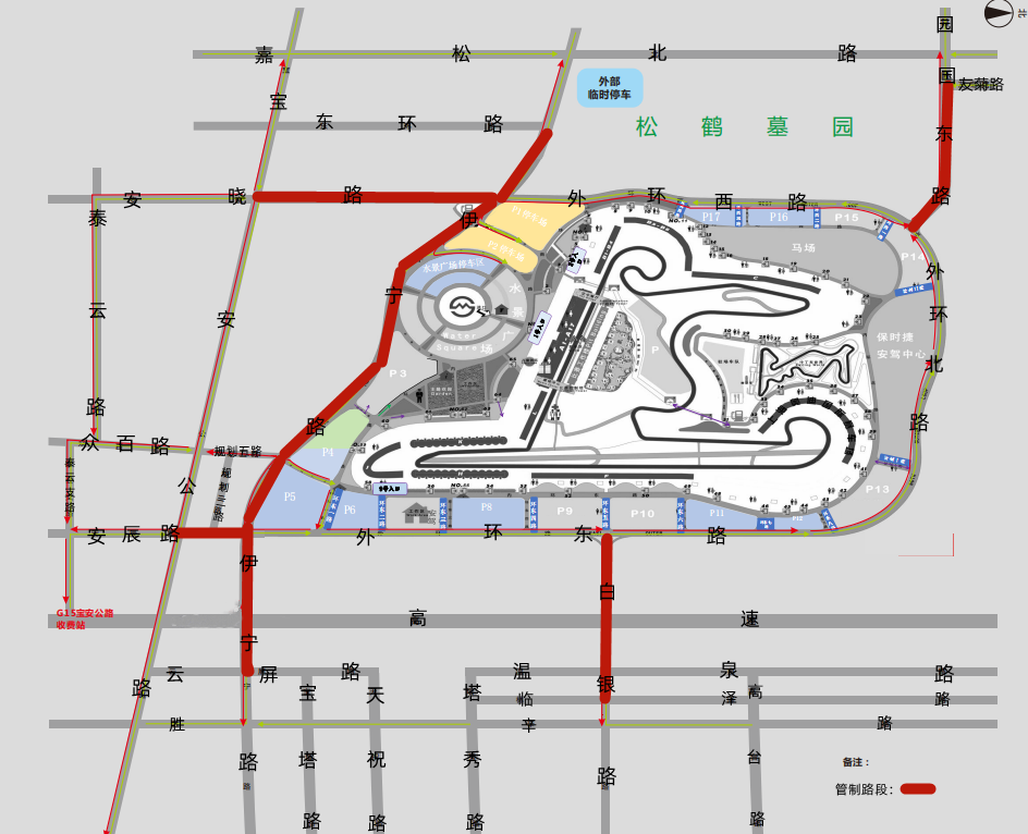 从嘉安公路嘉松北路口起,沿嘉松北路一宝安公路一胜辛路一至胜辛路叶城路口止所组成的范围,适时禁止无内场停车证的机动车及非机动车进入F1赛场内部(不含以上道路)。警方在周边点位共设置了8个验证点开展管控疏导工作,持证人可根据停车证的号码选择就近验证点进入,届时,验证点民警也会对司机进行引导。