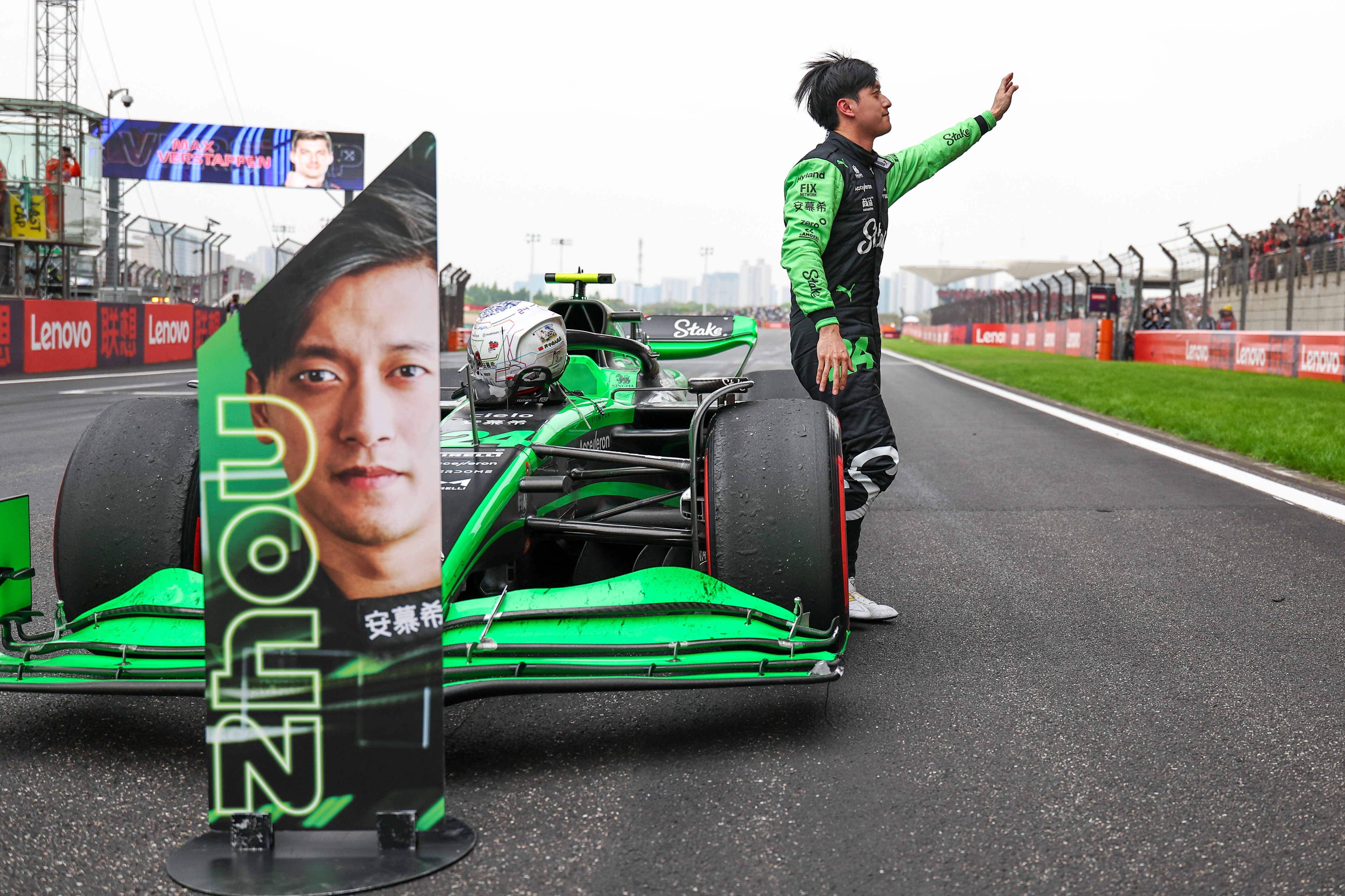 4月21日,索伯车队中国车手周冠宇在F1中国大奖赛后向看台观众挥手致意。新华社发(钱俊摄)