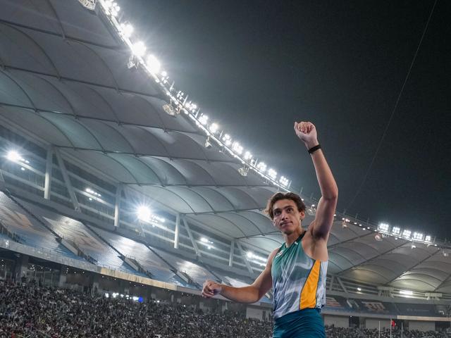 4月27日,瑞典选手杜普兰蒂斯在赛后向观众致意。新华社记者 李博 摄