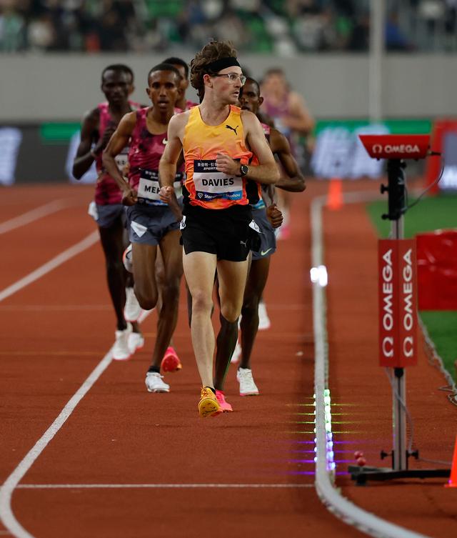 4月27日, 参加男子5000米的选手们在布有Wavelight技术(“激光兔”)的赛道上比赛。新华社记者 王丽莉 摄