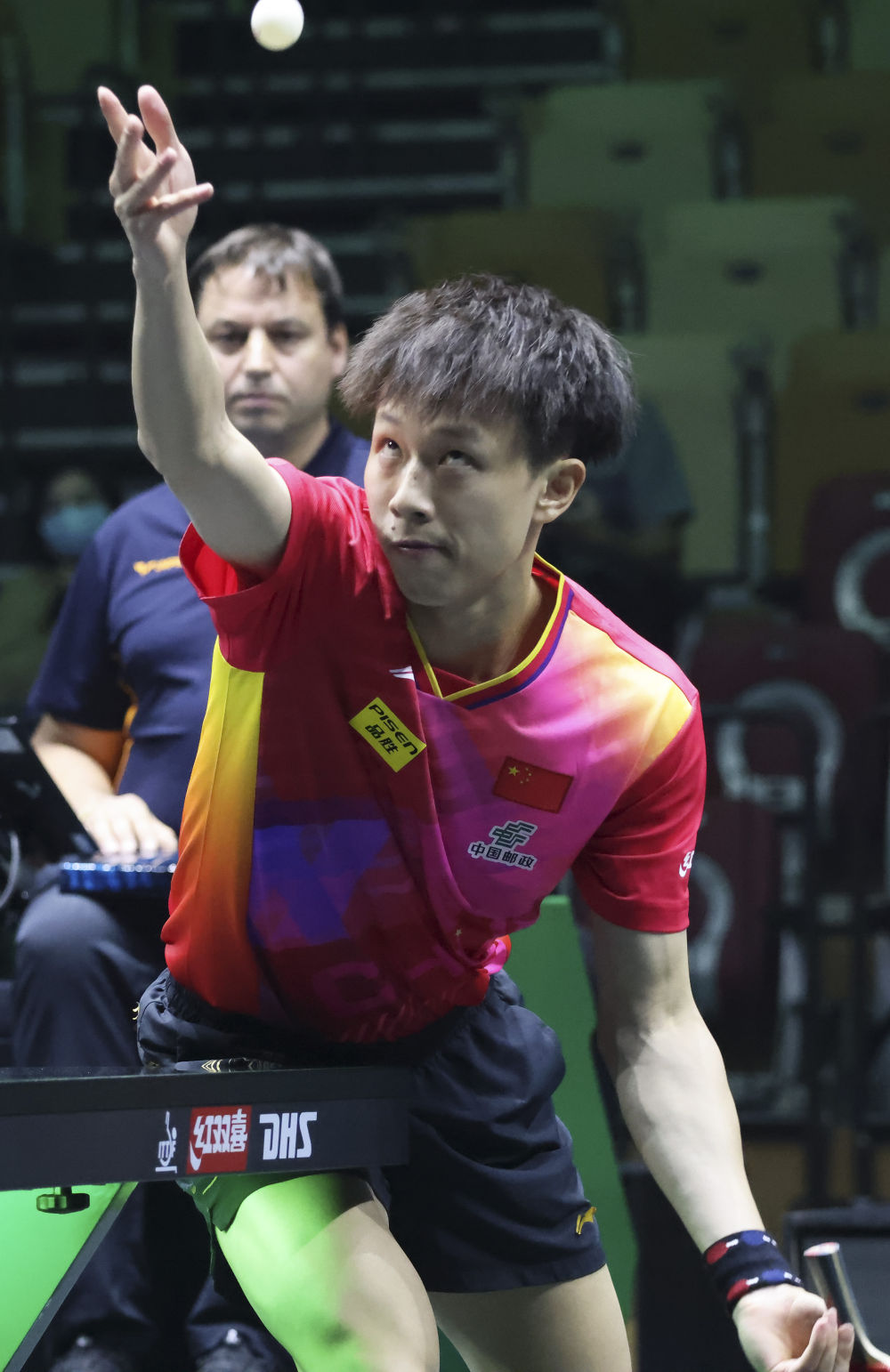 ↑中国选手林高远在比赛中发球。