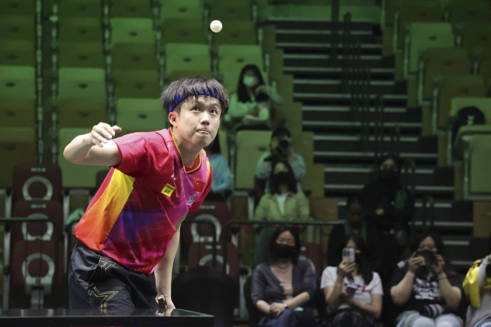 ↑中国选手王楚钦在比赛中发球。