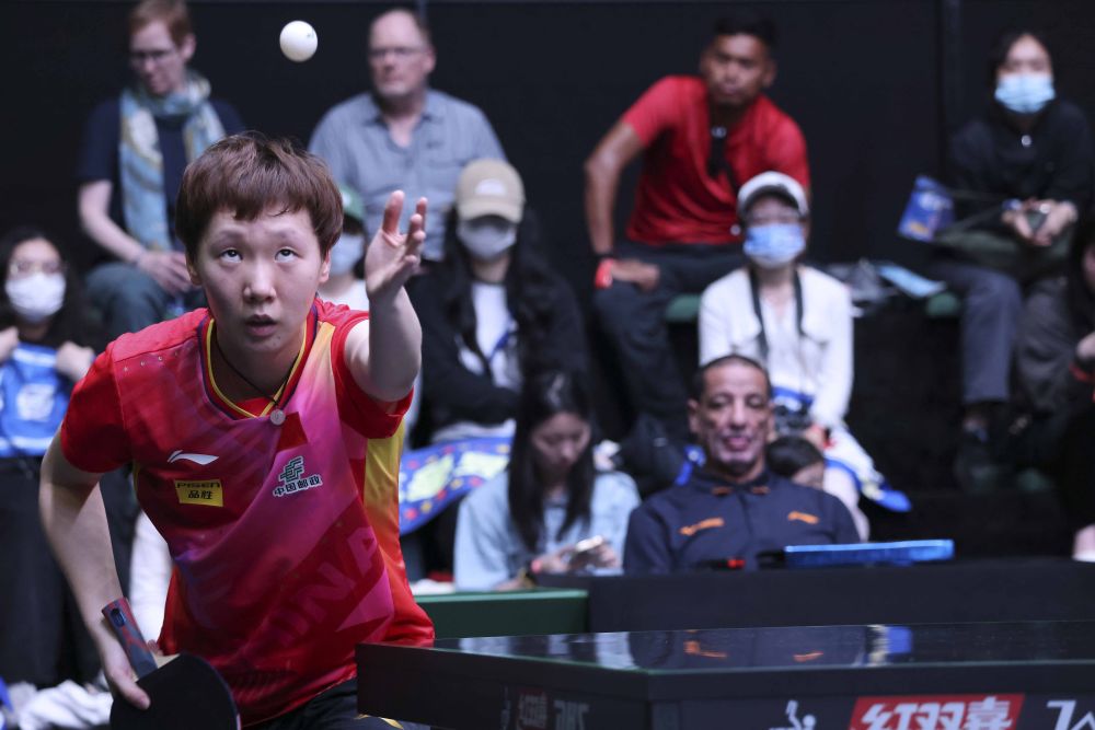 ↑中国选手王曼昱在比赛中发球。
