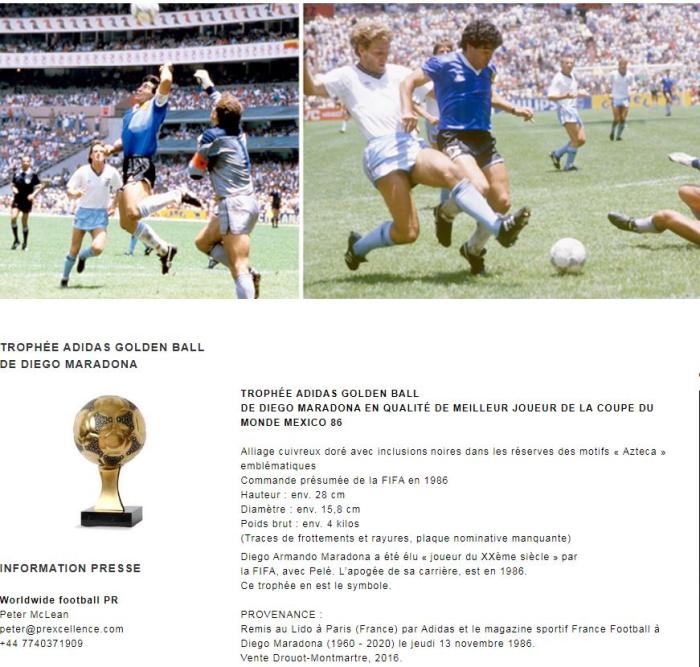 据外媒报道,已故足球巨星马拉多纳在1986年世界杯上获得的象征最佳球员荣誉的金球奖杯,将在6月份被拍卖。拍卖行预计,奖杯会以数百万美元的价格成交。