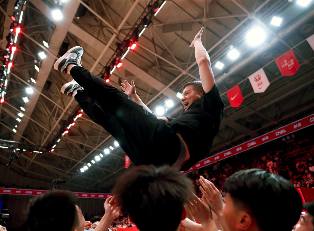 5月19日,湖南地质中学队主教练彭志强(上)被球员抛起庆祝。 新华社记者 雒圆 摄