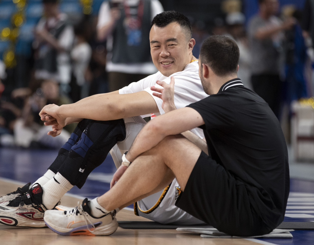 5月20日,辽宁本钢队球员韩德君(左)在比赛前。新华社记者 雒圆 摄