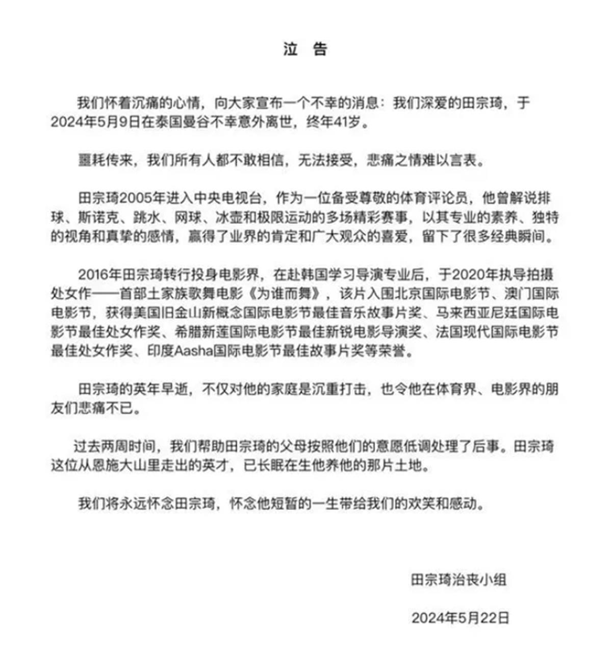 讣告透露了田宗琦去世的细节,他于今年5月9日在泰国曼谷意外离世,终年41岁。过去两周时间,朋友们按照田宗琦的父母意愿,低调处理了后事。