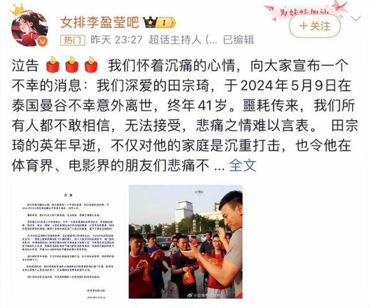 田宗琦的不幸离世,让许多关注中国女排的博主和网民十分悲痛。