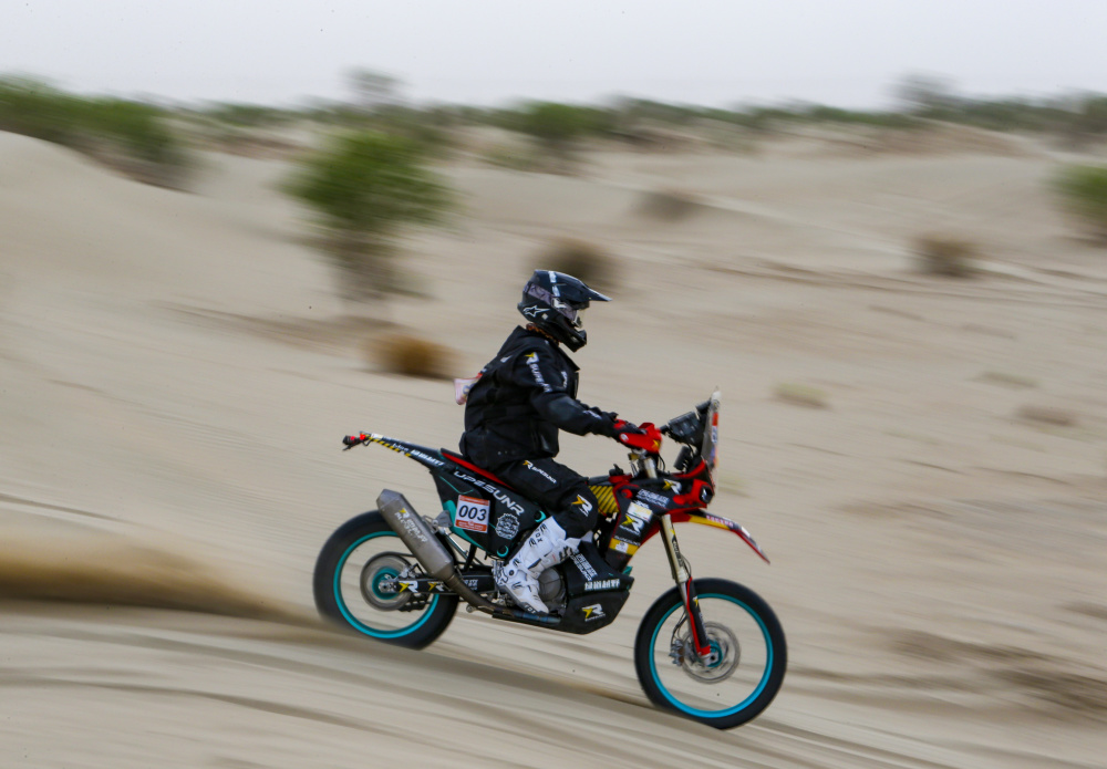 当日,2024年中国环塔国际拉力赛完成第三赛段比赛。该赛段在新疆喀什地区麦盖提县的沙漠中,全长原定约280公里。由于天气原因,摩托车组赛程缩减至约150公里。