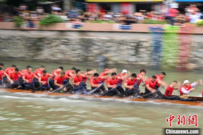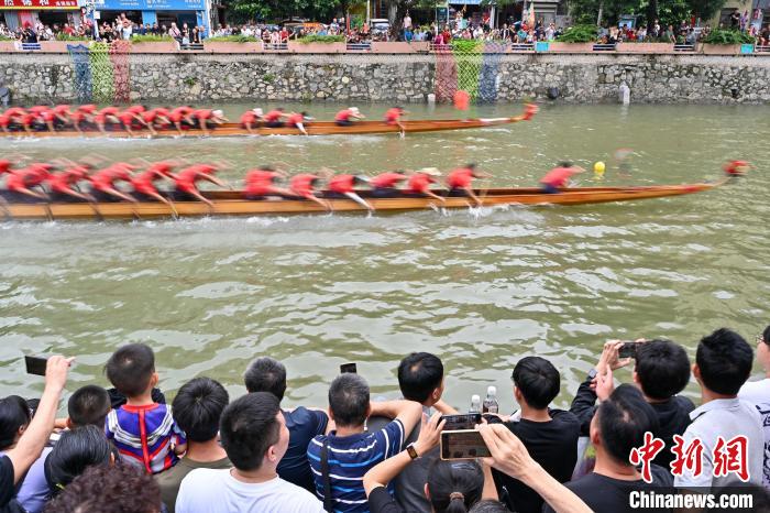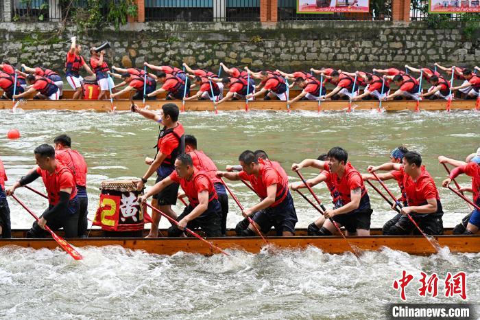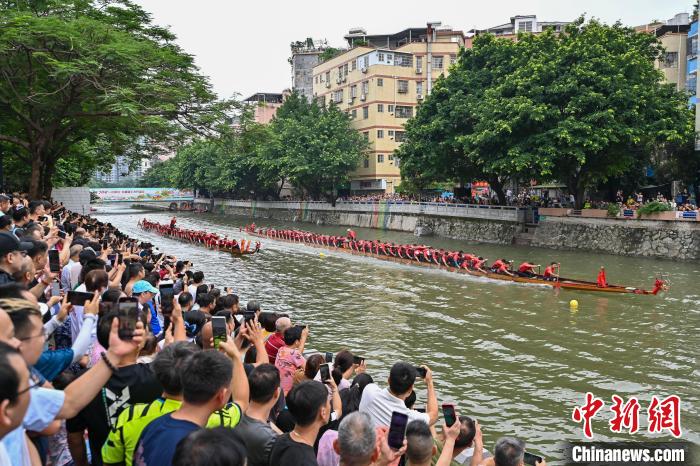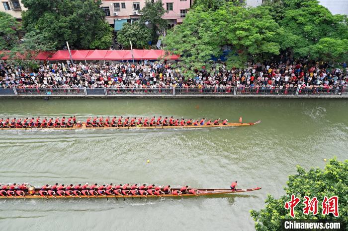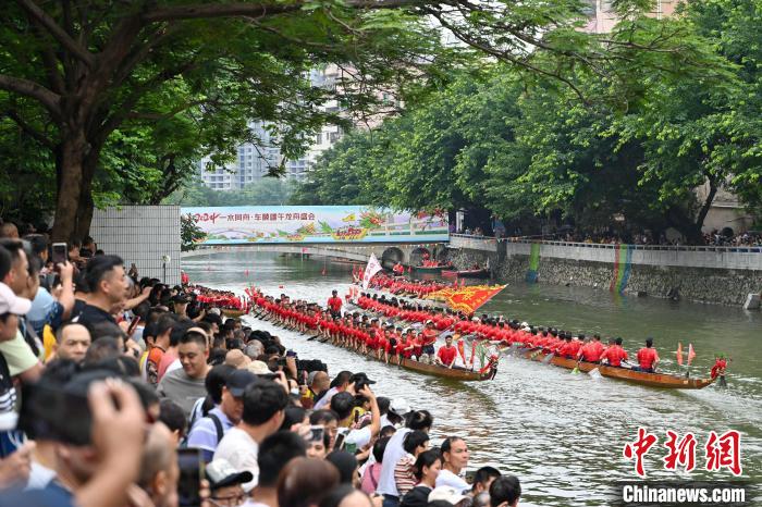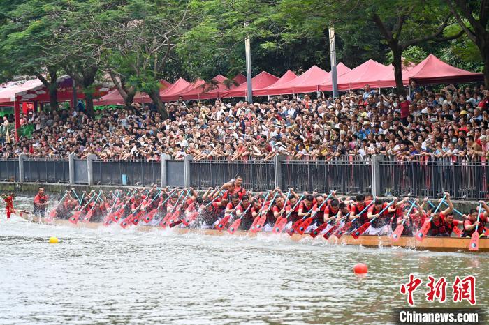 6月5日,端午节将至,“2024一水同舟•车陂端午龙舟盛会”在广州车陂涌內举行,来自车陂村的12支龙舟队展开激烈角逐,为市民游客上演一场赛龙夺锦的竞速盛宴。图为比赛现场。陈骥旻摄