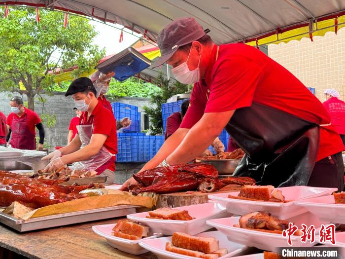 香芋扣肉软糯香浓,象征着富饶与和谐;清蒸多宝鱼鲜嫩滑爽,寓意富贵与多彩生活;烧鹅拼烧肉香气四溢,代表着丰收与喜悦;顺福葱油鸡色泽金黄,象征着繁荣与吉祥……“龙舟饭吃了几十年,每一道菜都好好吃,是我们对美好生活的祈愿和向往,象征着团结、和谐与丰收。”人和镇建南村村民朱伯说。(完)