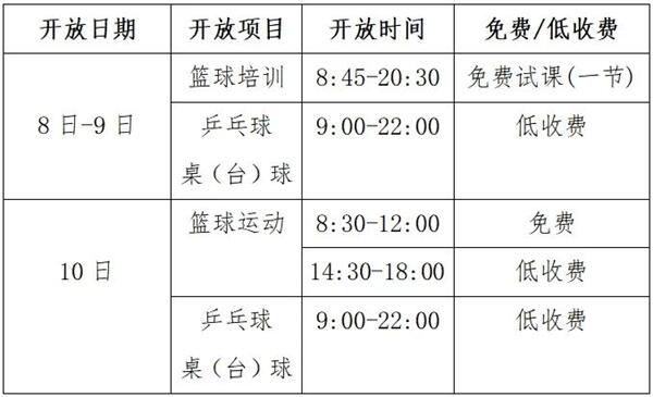 开放时间:体育馆为每天的8:00—11:30、15:00—17:00、18:30—20:30,其他的场地为全天对外开放。
