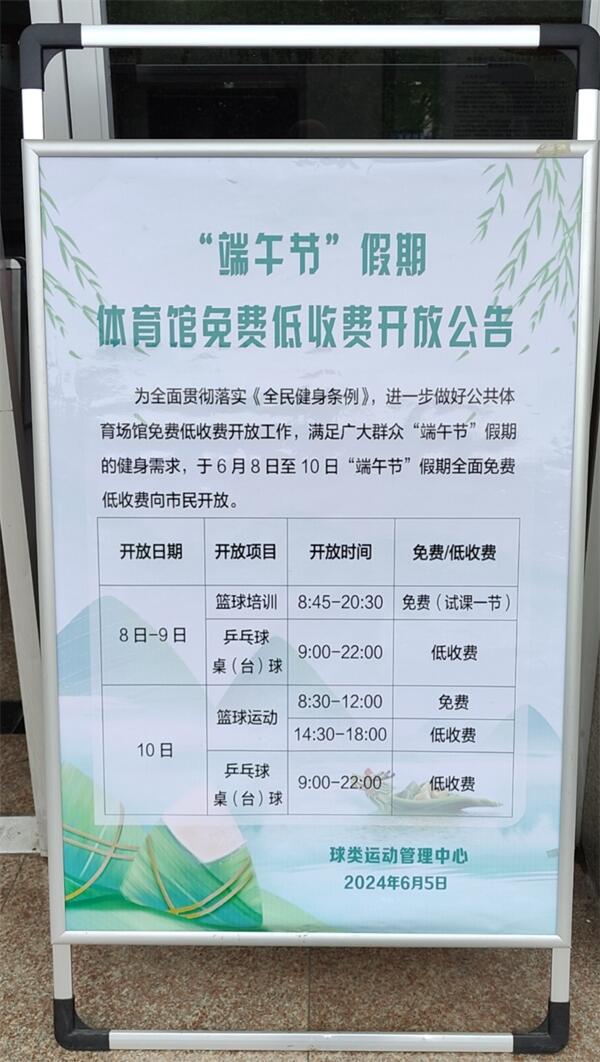 为全面贯彻落实《全民健身条例》,进一步满足广大体育运动爱好者的健身需求,永州市全民健身服务中心将继续做好2024年端午节假期场馆免费低收费开放工作,现将具体开放事宜通告如下: