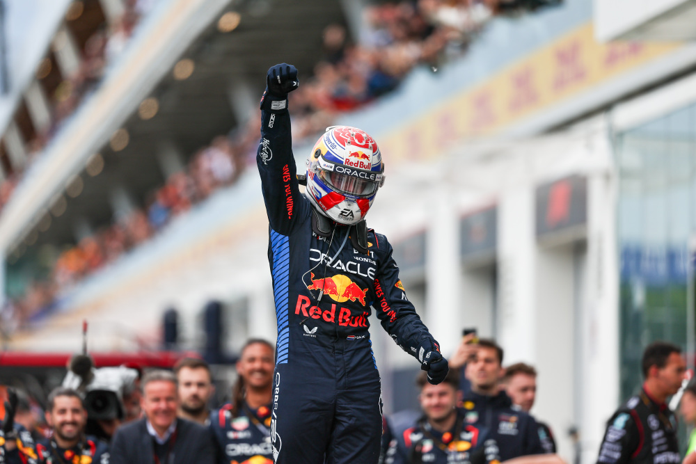 6月9日,马克斯·维斯塔潘赛后庆祝胜利。新华社发(宋海源摄)