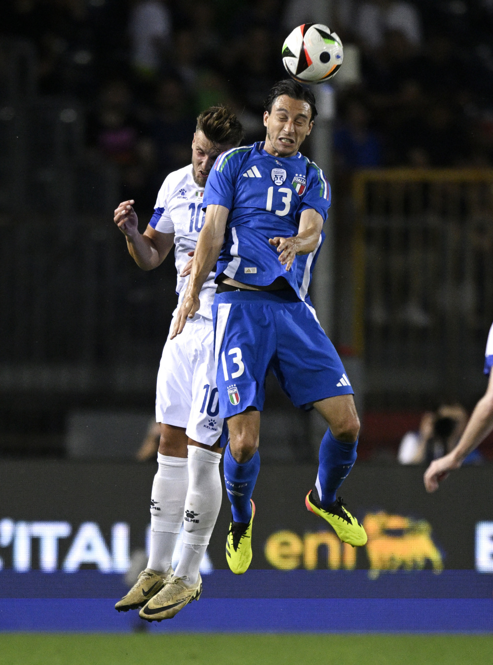 6月9日,意大利队球员达米安(右)与波黑队球员德米罗维奇争顶。新华社发(阿尔贝托·林格利亚摄)