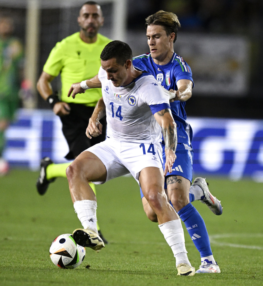 6月9日,意大利队球员法焦利(右)与波黑队球员萨里奇拼抢。新华社发(阿尔贝托·林格利亚摄)