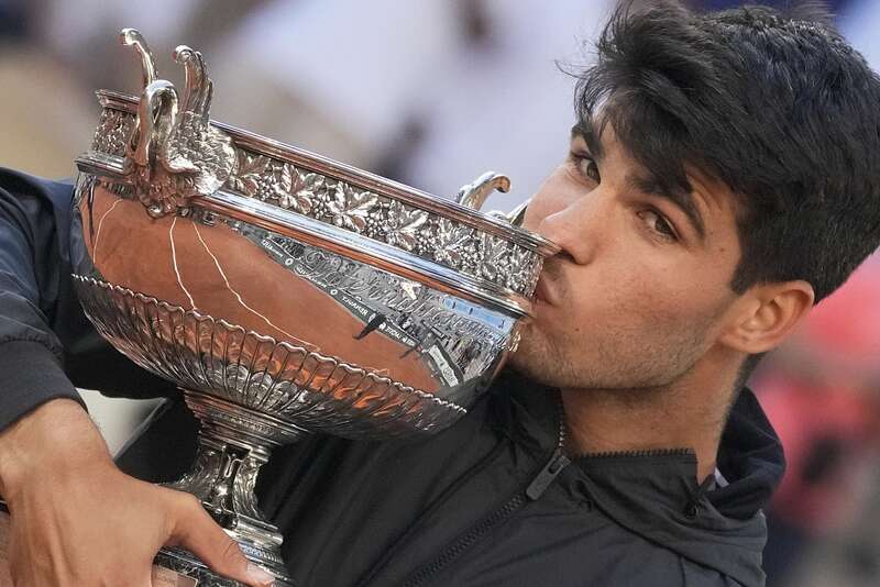 当地时间6月9日,西班牙选手阿尔卡拉斯在法国巴黎捧起2024年法国网球公开赛男单冠军奖杯。视觉中国供图