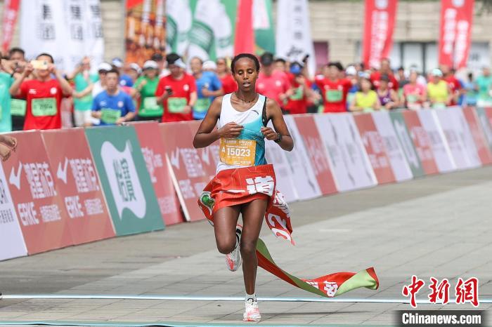 6月16日,2024贵阳马拉松赛在贵州省贵阳市观山湖区鸣枪开跑,赛事分为马拉松、半程马拉松、迷你马拉松,共吸引3.2万名选手参赛。在马拉松女子组比赛中,埃塞俄比亚选手ROBIGENETTADESSE以2小时44分22秒夺冠。 中新社记者瞿宏伦摄
